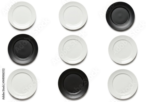 Arrangement of white and black plates on a white surface in a three by three grid pattern view from above