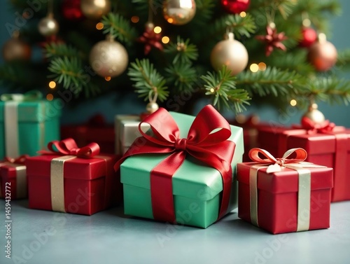Array of colorful gift boxes adorned with elegant satin bows, positioned beneath a lush Christmas tree , satin bows, packaging, festive