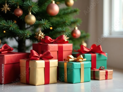 Array of colorful gift boxes adorned with elegant satin bows, positioned beneath a lush Christmas tree , season, elegant, blue