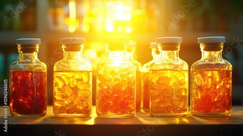 Array of glass bottles filled with Vitamin D capsules and tablets, illuminated by soft natural light, highlighting winter supplementation options.