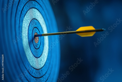 Arrow shot in bullseye of a blue target, strategy aim, business success, challenge performance