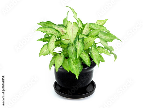 Arrowhead vine plant in black clay pot isolated on white background. Common names include arrowhead philodendron, goosefoot, African evergreen.