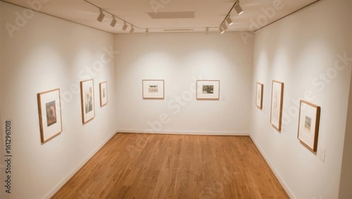 Art Gallery with Framed Pictures on White Walls and Wooden Floor