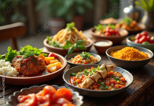 Artfully Arranged Local Cuisine on Engraved Wooden Table Surrounded by Fresh Ingredients and Rustic Utensils