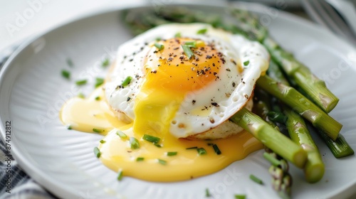 Artfully plated dish with a fried egg, asparagus, and hollandaise sauce
