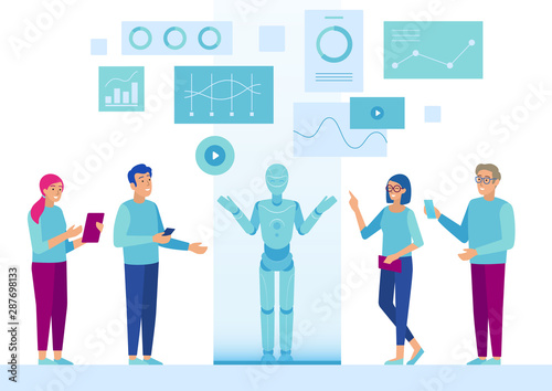 artificial, intelligence, human, communication, male, female, character, holding, contraption, chatting, robot, futuristic, technology, chat, bot, smart, device, cartoon, flat, vector, illustration, man, woman, girl, people, person, innovation, business, discussion, communicate, machine, science, robotic, electronic, digital, cyborg, cyber, computer, mind, talking, tech, machinery, information, mechanical, mechanism, reply, ask, reality, virtual, future