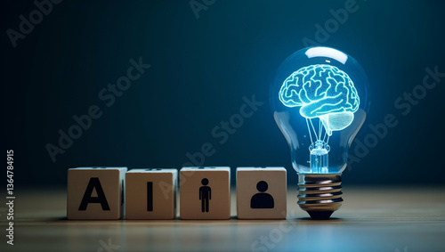 Artificial Intelligence Innovation: Exploring AI Adoption in Organizations, Human Competition, and the Digital Brain Concept with Visuals of Lightbulbs and Wooden Blocks