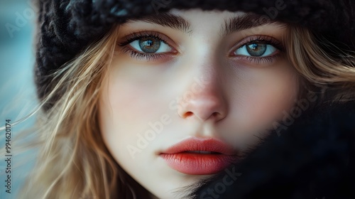 Artificial wool and fur. Close-up of the face of a young beautiful woman who has chosen a bright, stylish, fashionable and spectacular look for herself