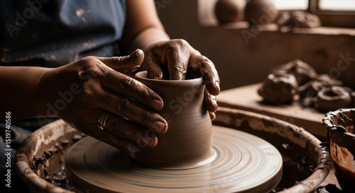 Artisan Hands Shaping Clay Pot on Pottery Wheel: Rustic Pottery Workshop Scene