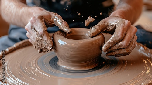 Artisan shaping clay on a potter's wheel in a craft studio during daylight hours