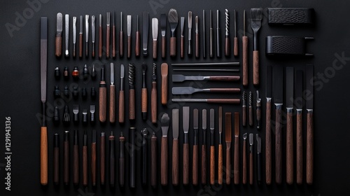 tool, artisan, craft, workshop, supply, carpenter's shop, carving, sculpting, black, background, equipment, art, hand-made, design, hobby, creation, project, industry, professional, collection, set, instrument, object, texture, pattern, material, wood, metal, steel, handle, sharp, precise, detailed, intricate, skill, creativity, craftsmanship, artistry, manufacturing, production, vintage, antique, retro