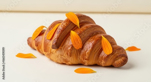 Artisanal Breakfast: A fresh, flaky golden croissant elegantly garnished with delicate yellow flower petals, representing a delicious and gourmet pastry for a morning meal or brunch.