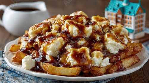 Artisanal Quebec poutine served with gravy and cheese curds on a rustic wooden table