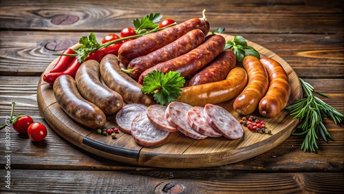 Artisanal sausages displayed on a rustic wooden platter , Gourmet, Delicious, Charcuterie, Rustic, Food photography