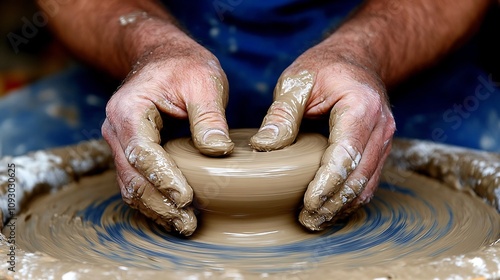 Artisan's Hands Shaping Wet Clay on Pottery Wheel in Blurred Workshop Background
