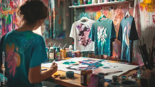 Artist Creating Customized T-Shirts with Fabric Paints and Stencils in a Vibrant and Creative Studio