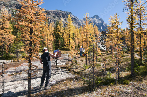 artist, autumn, canada, color image, easel, fall, larch, painting, rocky mountain, scenic, two people, tree, tree, softwood, coniferous, conifer, daytime, mountain, mountain, rocky, blue skies, people, horizontal