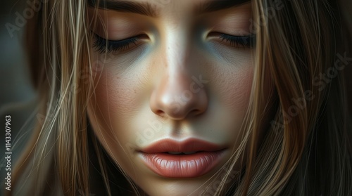 Artistic close-up of a young woman with closed eyes, natural makeup, and soft lighting, exuding a calm and introspective mood.