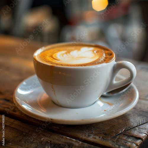 Artistic Coffee Cup on Wooden Table in Cozy Cafe Setting