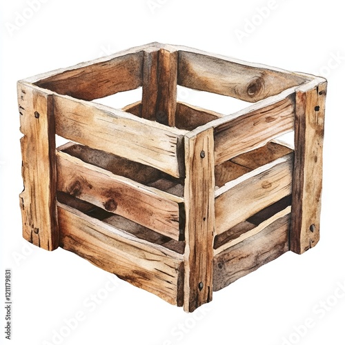 Artistic depiction of a wooden crate in watercolor, highlighting the intricate details of its texture with a clean, white backdrop