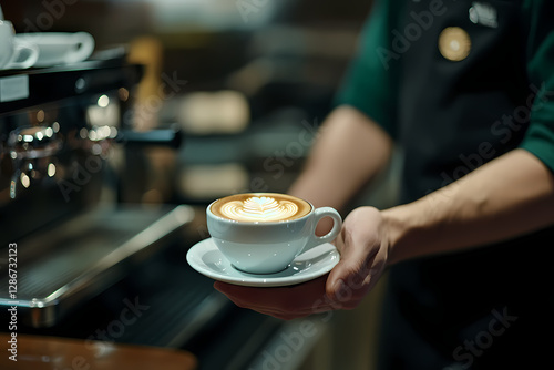 Artistic Latte: Barista delicately presents a freshly brewed latte with elegant foam art against the backdrop of a professional espresso machine.
