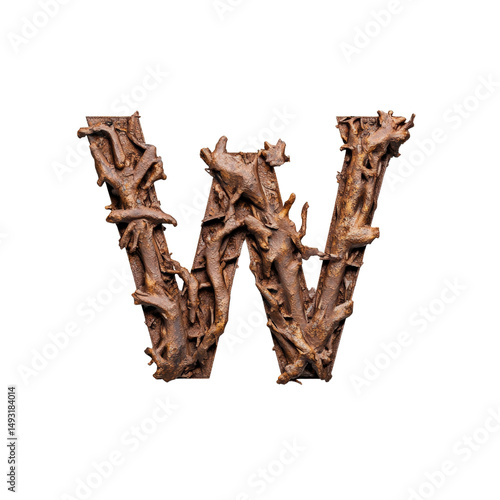 Artistic letter W constructed from intertwined dry natural woody branches with detailed texture and organic form