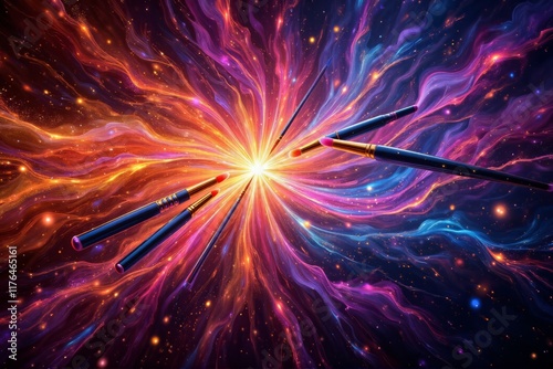 Artistic paintbrushes radiating from a central glowing point amidst swirling cosmic colors