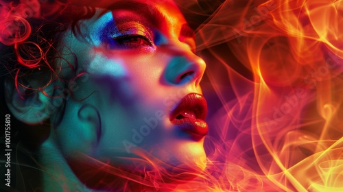 woman, portrait, artistic, surreal, bold, striking, beauty, fashion, dramatic, vibrant, creative, expressive, face, colours, cosmetic, glamour, fantasy, aethereal, make-up, smoky, colours, glowing, visual