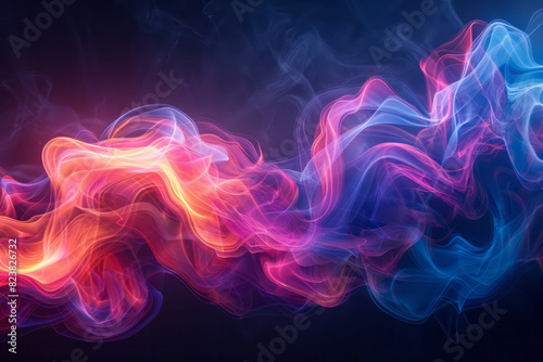 Artistic rendering of a lens acting as a source of colorful, abstract smoke-like trails of light,