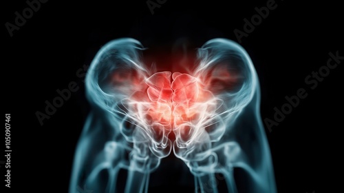 Artistic X-ray visualization of a skull showcasing a red glowing core, symbolizing complex themes of thought, emotion, and internal human processes.