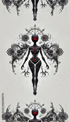 Artwork of a biomechanical demons surrounded by gothic-style with intricate lace detailing in white background. Generative AI.