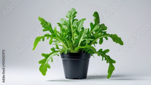 Arugula flourishing in a pot, set against a background, with a clipping path and full depth of field.