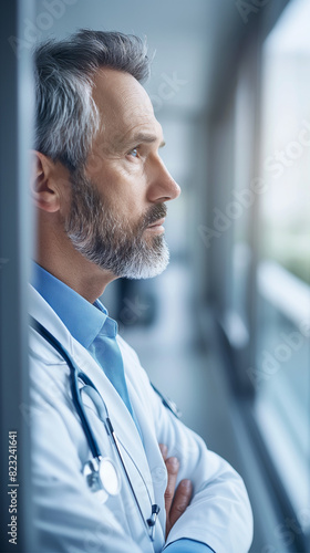 Arzt Mann mit Bart und Arbeitsmantel schaut zum Fenster hinaus