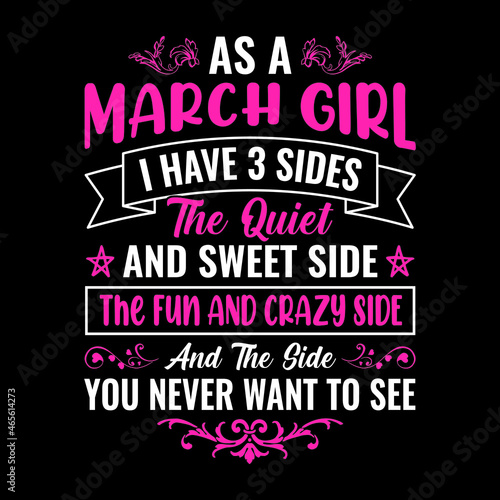 as a March girl I have 3 sides the quiet and sweet side the fun and crazy side and the side you never want to see - Typographic vector t shirt design for girls