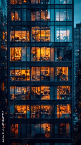 As dusk settles over the city, warm lights illuminate office windows, revealing a hive of activity within. The bustling environment contrasts beautifully with the approaching night