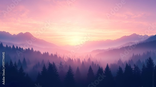 As the day begins, a tranquil sunrise unfolds, casting a soft pastel glow over the misty mountains and lush green forests, creating a serene and picturesque landscape that truly captivates the eye