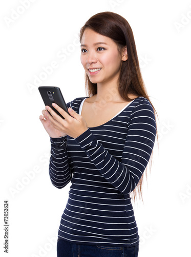 woman, lady, girl, female, japanese, korean, chinese, asia, asian, casual attire, wear, clothes, tee, t-shirt, top, sport, long, sleeve, apparel, mobile, phone, mobile phone, phone, smartphone, message, text, screen, read, look, isolated, white, background, people, person, portrait, 1, cut-out, studio, young, youth, junior, blue, beautiful, pretty, smile, happy, away