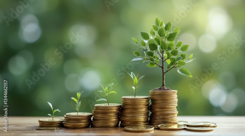 ascending stacks of golden coins with growing plants symbolize financial growth and prosperity