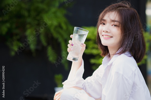 Asia woman drinking water with happy.