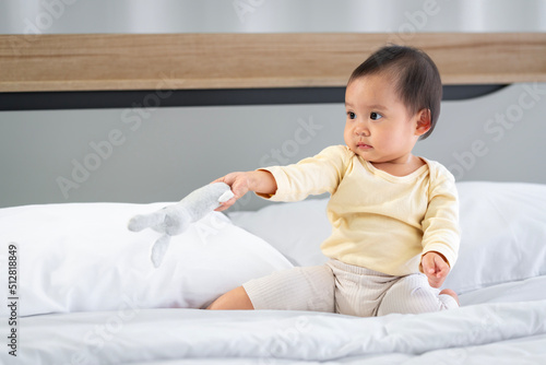 Asian baby girl with white skin and big eyes naughty age playing on the bed by the bedroom window