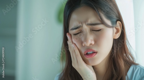 Asian beautiful woman feel terrible toothache after drink cold water. Attractive female sit on sofa in living room touching cheek, feel hurt and suffering from sensitive tooth ache, pain and cavities.