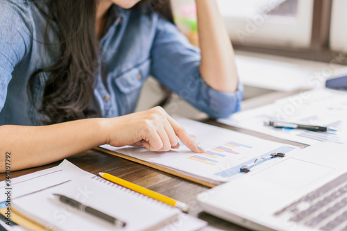Asian beautiful woman thinking brainstorming for future business using document statistics, feeling stress tired, working from home office work desk panning ideas and strategy, isolation quarantine