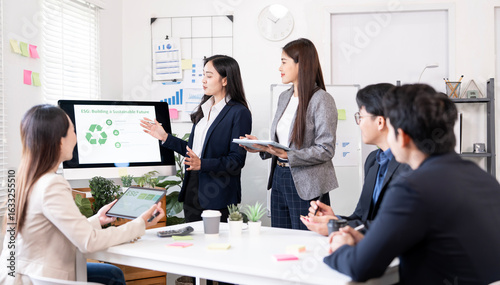 Asian business team presenting ESG strategy during a meeting in modern office, discussing sustainability goals and data on digital devices with positive collaboration.