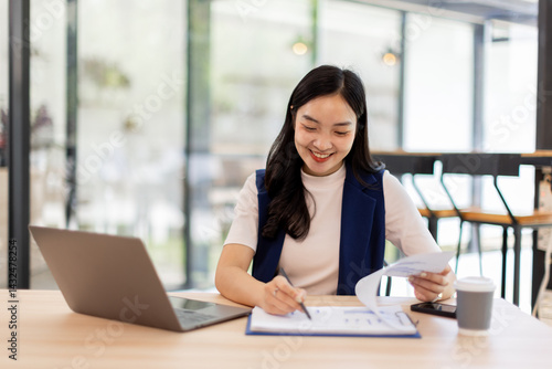 asian business woman sit at laptop holding papers, read received contract, agreement, legal documents smile feel satisfied, got good news. Loan repayment, career advance, success concept