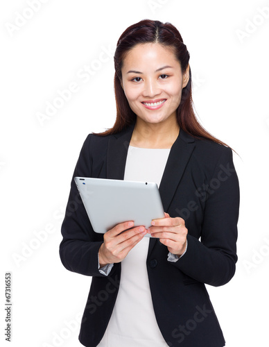 tablet, digital, technology, finger, condensed, read, look, computer, touch, use, hold, hand, pad, electronic, suit, professional, boss, staff, work, successful, job, manager, woman, lady, girl, female, beautiful, charming, 1, portrait, business, businesswoman, secretary, executive, officer, young, attractive, pretty, positive, smile, happy, asia, asian, chinese, korean, japanese, isolated, white, background
