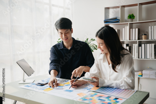 Asian businessman and woman people meeting in office. Employee brainstorm and work as team, plan and discuss project by point on paper and tablet. .