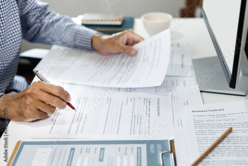 asian businessman reviewing contract document at office. legal expert, professional lawyer working with computer reading and checking financial documents and business contract
