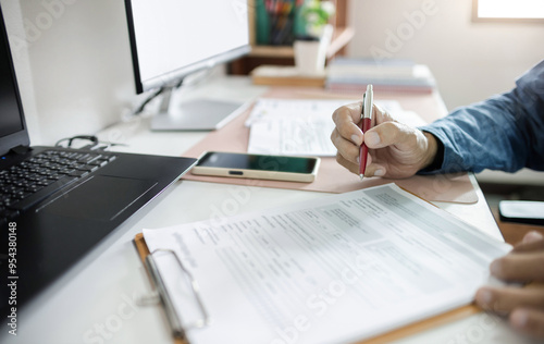 Asian businessman working on desk with laptop and desk top PC holding pen checking business contract and document report before sign