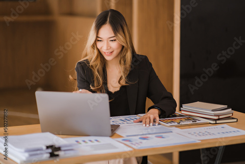 Asian businesswoman in formal suit in office happy and cheerful during using smartphone and working