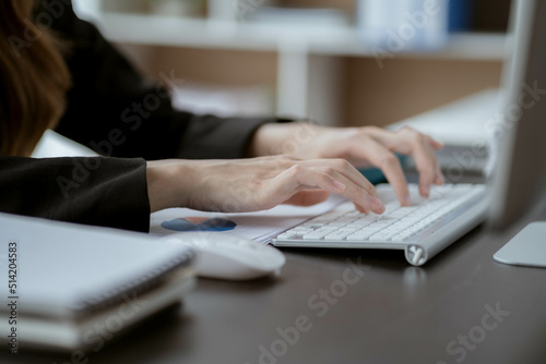 Asian businesswoman in formal suit in office happy and cheerful during using smartphone and working
